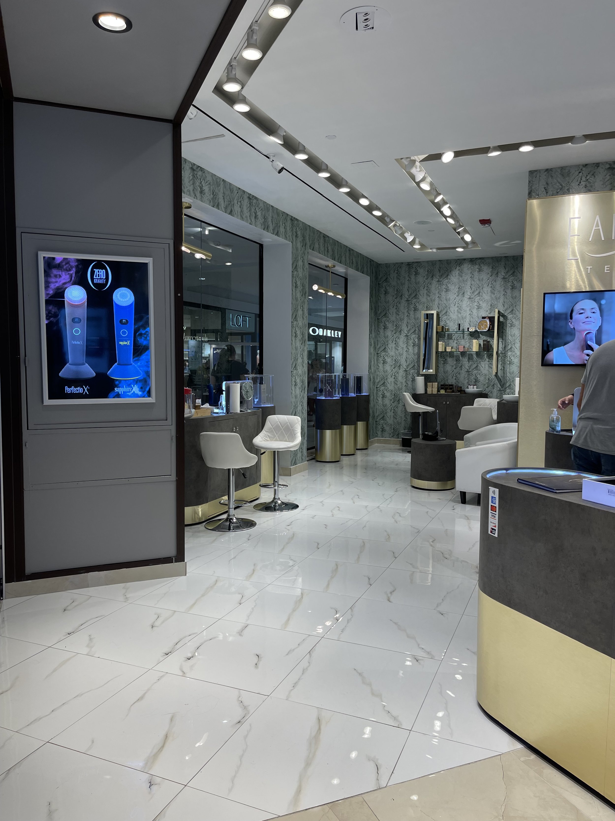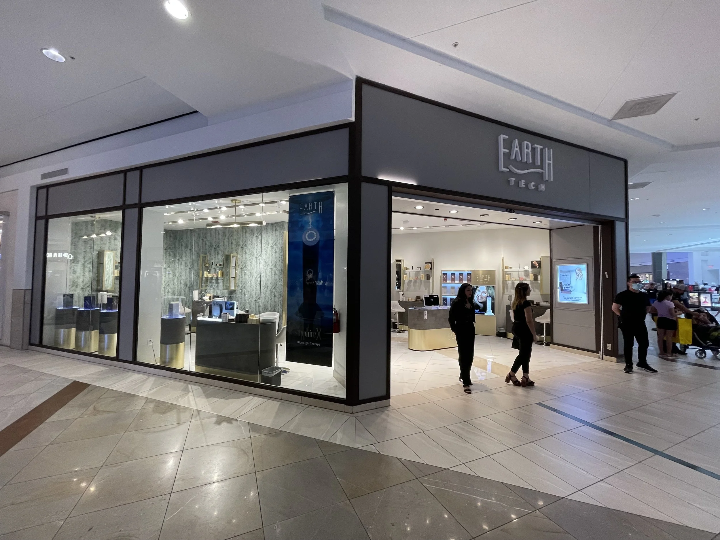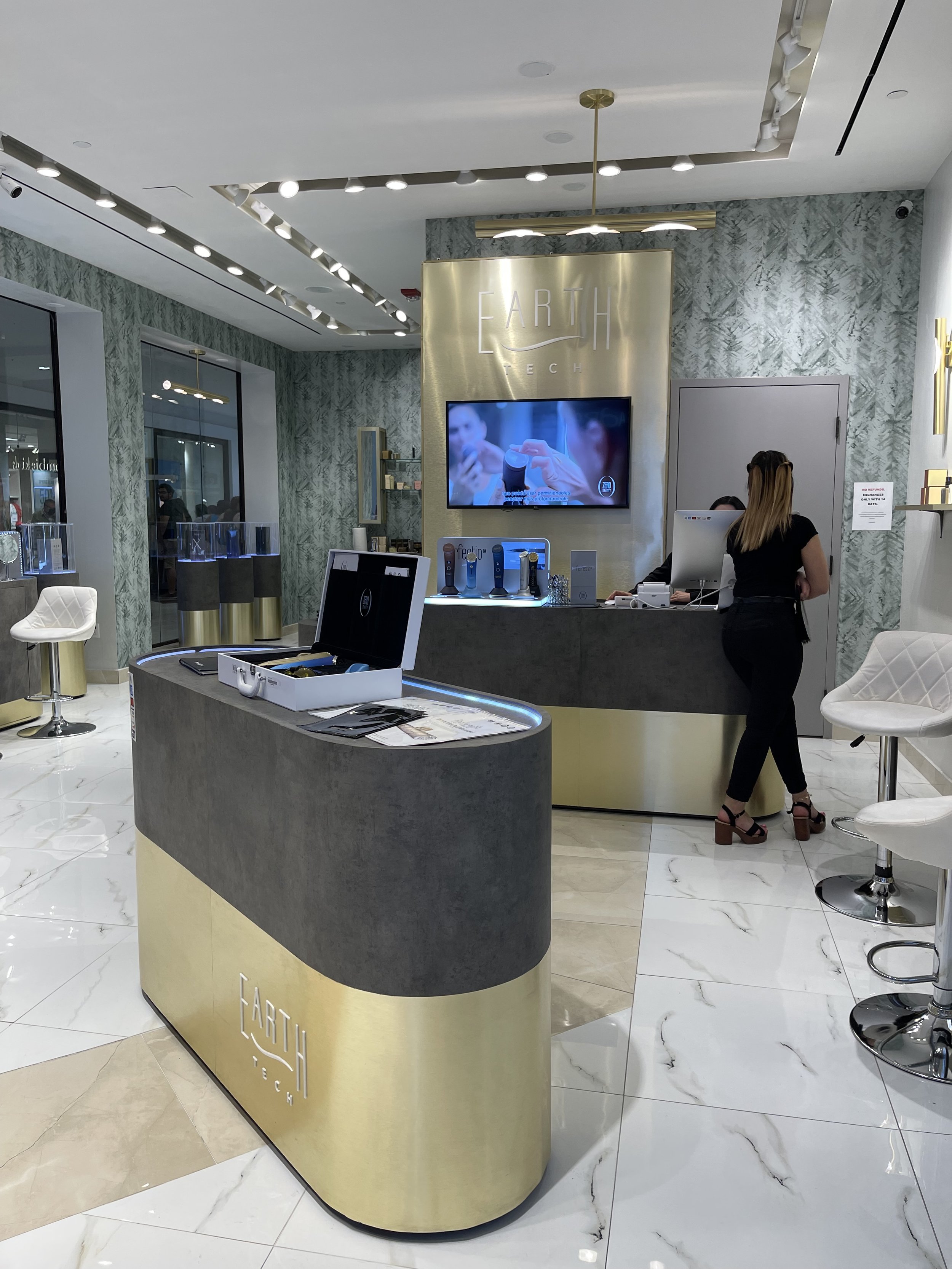 Earth Tech La Plaza Mall es un local comercial de productos de cuidado de la piel, ubicado en La Plaza Mall en McAllen, Texas. Construido por GHL Proyectos en 2021, este proyecto destaca por su diseño innovador y el uso de materiales como lámina dorada de acero rallado, porcelanato y papel tapiz.